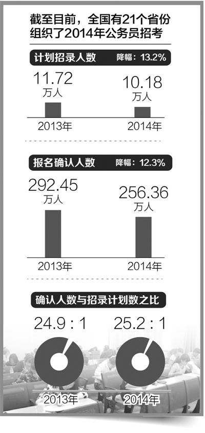 统计结果显示,2014年上半年有15个省(区、市)缩减了招录计划,主要是落实中央“财政供养人员总量只减不增”要求,各地严控招录规模,导致招录计划缩减。另外,新一轮机构改革对招考工作也有一定影响。有17个省(区、市)报名确认人数下降,这一“降”,也成为近期社会关注的焦点,主要原因可能还是受到了招录计划减少的影响。