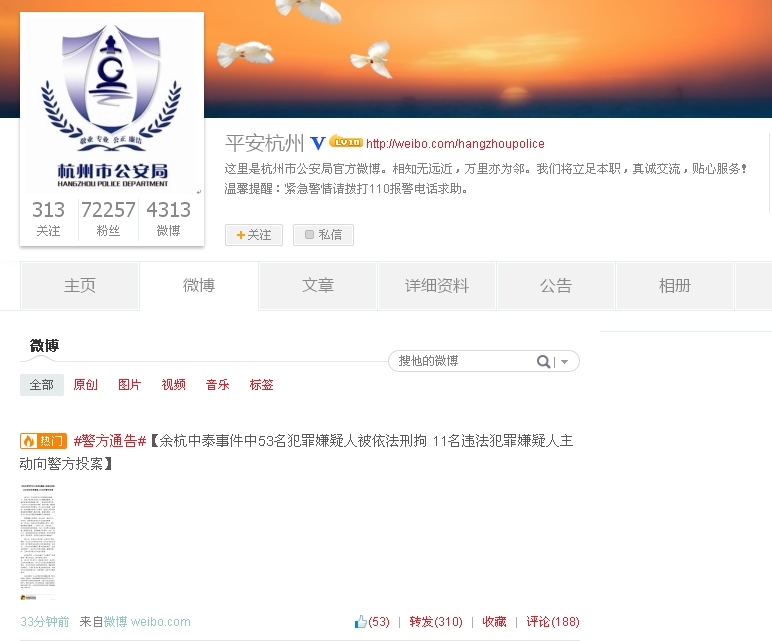 人民网北京5月12日电(刘茸)今日17时30分,杭州市公安局通过其官方微博发布了一份对余杭中泰事件处理结果的通告,称有53名犯罪嫌疑人被依法刑拘,11名违法犯罪嫌疑人主动向警方投案,涉及的罪名包括聚众扰乱公共秩序、妨碍公务和寻衅滋事。此外,还有7名与此事有关的人员因涉嫌网上散布谣言而被处以行政拘留。