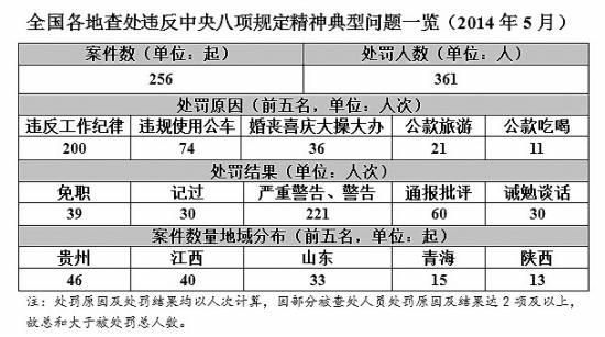 今年以来,中纪委加大了对违反中央八项规定情况的通报力度。中国青年报记者对上月通报情况进行了统计梳理发现,5月,中央纪委监察部网站共通报全国各地违反中央八项规定典型案例256起,涵盖了27个省(区、市)新疆生产建设兵团和中国移动公司,点名曝光361人。问题包括违反工作纪律、违规使用公车、公款旅游、婚丧喜庆大操大办、公款吃喝等。