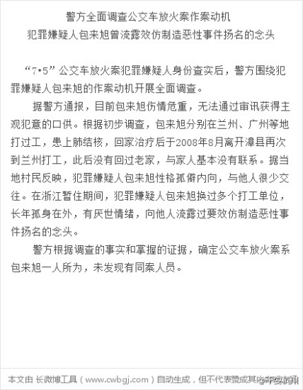 中新网7月8日电 据杭州公安局微博“平安杭州”消息,杭州公交车纵火案犯罪嫌疑人包来旭曾流露效仿制造恶性事件扬名的念头。