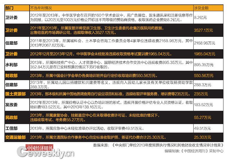 《2013年度审计工作报告》指出,一些中央部门主管的社会组织和所属单位依托行政资源不当牟利。至2013年底,卫计委、国土资源部、住建部等13个部门主管的35个社会组织和61个所属事业单位利用所在部门影响,采取违规收费、未经批准开展评比达标、有偿提供信息等方式取得收入共计29.75亿元。