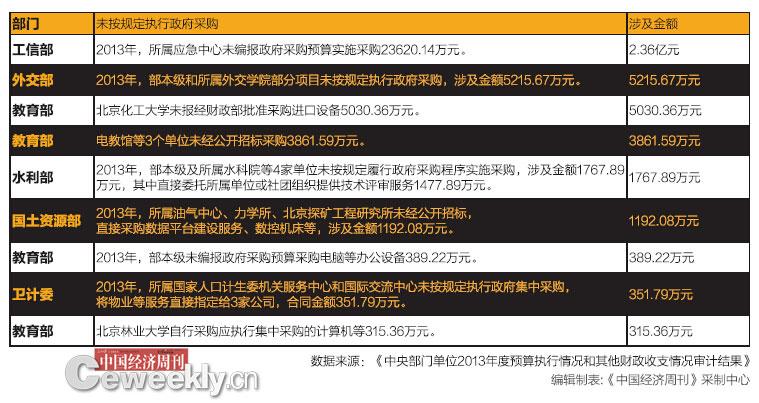 从审计结果可以看出,有关部门在政府采购制度执行上不够严格。工信部、水利部、外交部、教育部、国土资源部、卫计委等部门均因此被审计署点名(详见表2)。其中,金额最高的是,2013年,工信部所属应急中心未编报政府采购预算实施采购2.36亿元。