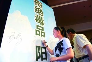 昨天,人艺演员孙茜在拒绝毒品背板上签名。