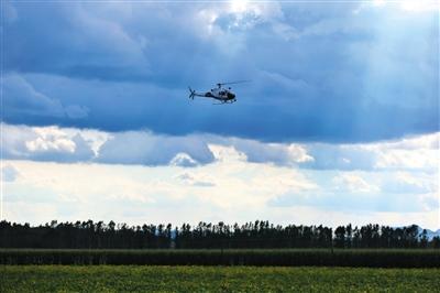4日,哈尔滨市延寿县青川乡百合村,直升机在农田上空盘旋搜索。