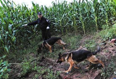 警察分成若干小队,每队约30到40人,两三名村民做向导。村民唐晓伟和韩明带的队由40名特警组成,沿张润库屋后的玉米地向东搜捕。