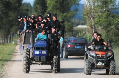 4日,延寿县青川乡百合村,一位村民用拖拉机拉着一车特警赶往搜捕现场。新京报记者 薛珺 摄