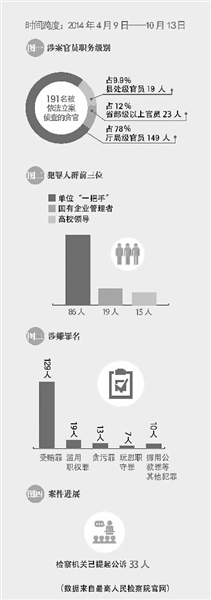记者在梳理最高检发布的职务犯罪大要案信息时发现:从4月9日开始,最高检密集发布依法立案侦查重大案件信息。截至10月13日,在6个多月的时间内,已经披露全国检察机关依法立案侦查县处级以上贪官191人,平均每天都有1名厅局级以上贪官被查处。