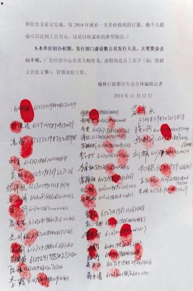 记者在位于榆林日报社内的《榆林晚报》采访部发现,多数记者和编辑仍在忙碌。他们告诉记者,举报信确实是大家联名发的,报社42名编辑记者中,除两人不在单位,另有两人明确表示不参与外,其他38人都在举报信上签名按了手印,并写上了本人的身份证号。