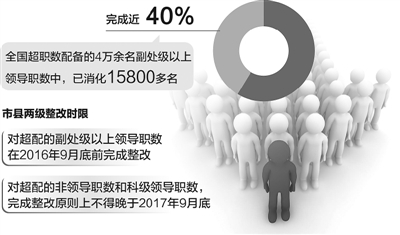 ——针对有的地方“新人不理旧账”“拉长战线搞拖延”的问题,建立整改工作责任机制。一是突出重点。要求各地各单位重点解决副处级以上领导职数超配问题。市县两级实行整改时限“阶梯”制度:超配的副处级以上领导职数在2年内(2016年9月底前)完成整改任务;对超配的非领导职数和科级领导职数,由各省(区、市)、中央和国家机关部委组织人事部门结合实际确定整改时限,原则上不得超过3年(2017年9月底前)。二是实行整改消化责任制。明确党委(党组)主要负责人为整改消化第一责任人,组织人事、机构编制部门主要负责人为直接责任人。