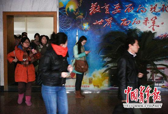 2014年12月13日,北京市各级机关2015年考试录用公务员公共科目笔试结束,考生正陆续走出考场。工作重、压力大、工资低,成为近年来基层公务员最多的抱怨,这也影响了很多人对报考公务员的热情。本报记者 赵迪/摄
