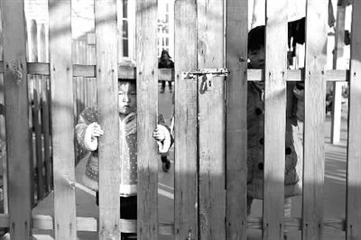 1月20日下午,北京市昌平区天使之家的两个孩子在院子里看着院外行人。张哲 摄