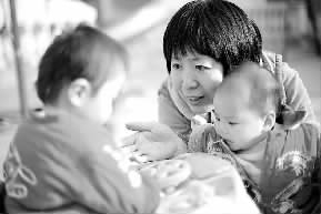 北京市昌平区天使之家负责人邓志新在引导两个小朋友交流。 张哲 摄