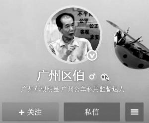 区少坤是广州人,今年62岁,他的新浪微博“@广州区伯”已加V认证,介绍栏里写着“广州草根明星,广州公车私用监督达人”,其粉丝量已超过10万。