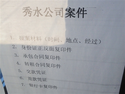 心存怀疑的投资者选择报案。因报案者众多,警方将此案定名为“秀水公司案件”(简称“秀水案件”)并对报案进行专门提示。新京报记者注意到,警方同时做出报案提示的十余起案件,案情基本与“秀水案件”相似,其中一些已明确为非法集资案件。办案民警称,目前已按照涉嫌非法吸收公众存款对秀水公司案件进行受理,具体案情尚在进一步调查中。