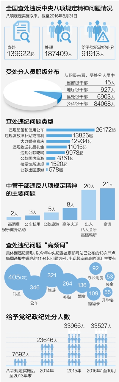 这是中央颁布八项规定四年来,各级纪检机关查处的违反中央八项规定精神的诸多案例中的一则。截至2016年8月31日,全国已累计查处违反中央八项规定精神问题139622起、处理187409人,给予党纪政纪处分91913人。