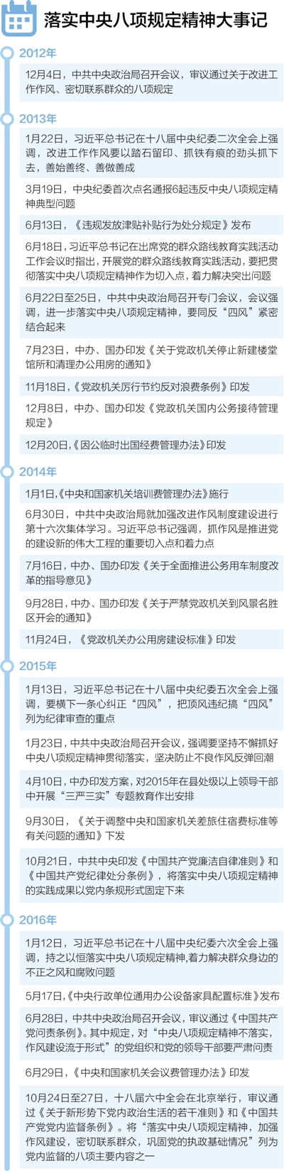 十八届六中全会通过了两个重要党内法规——《关于新形势下党内政治生活的若干准则》和《中国共产党党内监督条例》,其中都多次提及中央八项规定。