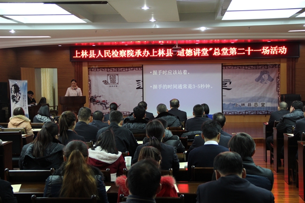 广西检察网12月8日讯(通讯员 覃榆翔)12月5日下午,上林县检察院在该县财政局六楼会议室举办“道德讲堂”社交礼仪专场活动,该院全体干警及该县预防共建单位共100余人参加了此次活动。