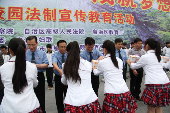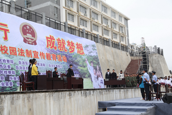 “我们大石山区的学生,特别需要得到社会的关爱,特别需要法制的阳光照耀,这样他们才能健康地成长。我们师生都希望像这样的大型法制宣传活动多走进学校。”乐业县高中校长黄炳仲激动地说。 据了解,这次大型法制宣传活动由广西壮族自治区检察院、百色市检察院和乐业县检察院牵头主办,自治区、百色市和乐业县三级人民法院、教育行政部门、共青团、妇联等相关单位也积极参与到活动中来,加上乐业县高中全体师生参加人数超过了2000人。