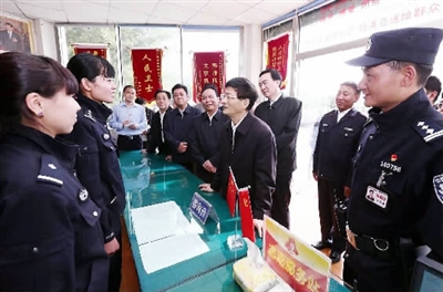 7月18日至22日,中共中央政治局委员、中央政法委书记孟建柱先后来到拉萨市和山南地区进行调研。图为7月18日,孟建柱在拉萨市布达拉宫广场便民警务站向执勤民警询问治安状况和便民服务举措。郝帆摄