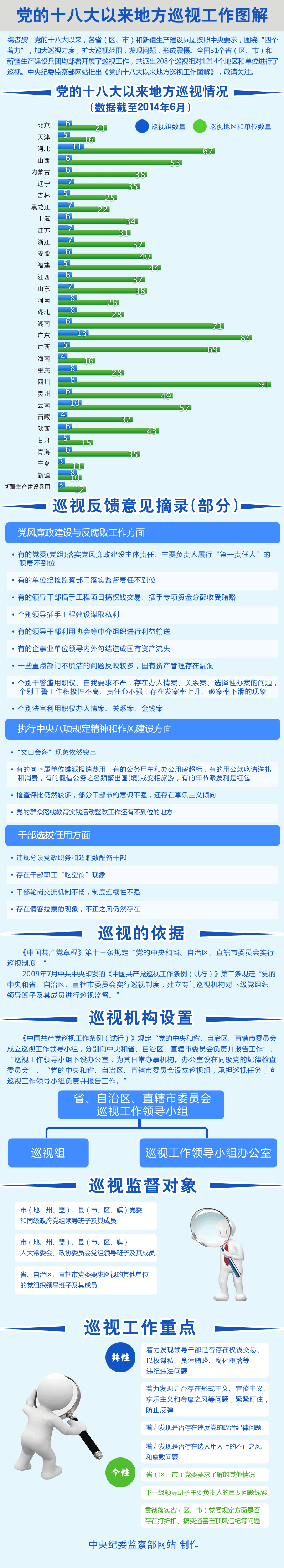 编者按:党的十八大以来,各省(区、市)和新疆生产建设兵团按照中央要求,围绕“四个着力”,加大巡视力度,扩大巡视范围,发现问题,形成震慑。全国31个省(区、市)和新疆生产建设兵团均部署开展了巡视工作,共派出208个巡视组对1214个地区和单位进行了巡视。中央纪委监察部网站推出《党的十八大以来地方巡视工作图解》,敬请关注。