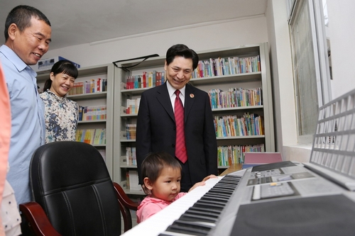 在“儿童家园”的图书室,一名小朋友热情地为崔智友展示“琴艺”