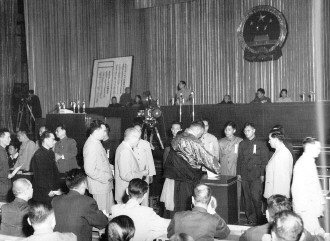 图4:1954年9月20日,出席一届全国人大一次会议的全国人大代表投票通过宪法。
