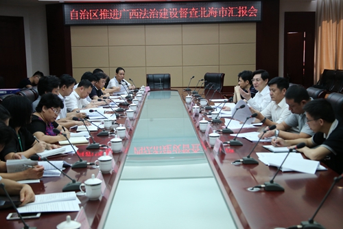 督查中,北海市委、市政府汇报了贯彻落实推进法治建设工作情况。崔智友认为北海市委、市政府推进法治建设的认识到位,方案周全,制度完善,措施给力,卓有成效。崔智友指出,经过长期努力,特别是1997年启动依法治桂工作以来,我区法治建设已取得较好成效。但目前我区法治建设仍然存在与时代发展要求不相适应,与人民群众期待不相符合,以及治理能力现代化水平不够高等突出问题。要解决这些问题就必须加快推进我区法治建设进程,充分发挥法治的引领和规范作用,提高改革发展各领域的法治建设水平,引导各地各部门运用法治思维和法治方式解决经济社会发展中的问题,不断提升依法执政水平和能力。广泛深入开展法制教育和法治文化培育,逐步提高群众法治素质,推进全民尊法信法守法用法,实现我区经济发展、政治清明、文化昌盛、社会公正、生态良好的发展目标。
