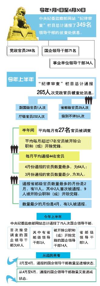 《法制日报》记者统计显示,今年1月1日至6月30日,中央纪委监察部网站“纪律审查”栏目总计通报了349名领导干部的查处信息。被通报的领导干部包括:党政官员244名,占比近7成;国企领导干部71名;事业单位领导干部34人。