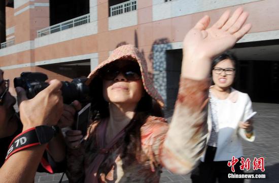 外逃贪官乔建军前妻赵世兰5月在洛杉矶出庭,离开法庭时躲避并阻止记者采访拍摄。 中新社发 毛建军 摄