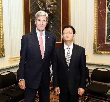 习近平主席特使、中共中央政治局委员、中央政法委书记孟建柱与美国国务卿克里举行会谈。郝帆摄