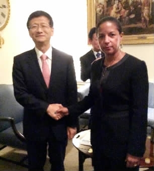 习近平主席特使、中共中央政治局委员、中央政法委书记孟建柱与美国总统国家安全事务助理赖斯举行会谈。郝帆摄