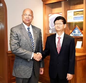 习近平主席特使、中共中央政治局委员、中央政法委书记孟建柱与美国国土安全部部长约翰逊举行会谈。郝帆摄