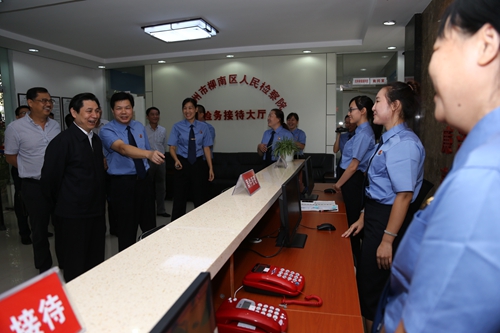 “接待、律师阅卷、查询等等这些都应该放在一起,检务接待大厅就该是一条龙服务,要把我们的‘窗口’前移,免得让群众跑上跑下。”“律师阅卷室都备有纸笔了吗?”“我建议,你们还应该在接待服务大厅内放置一些普法的小册子,这样既能方便群众了解我们检察机关的工作流程,又能为大家节省时间。”在柳南区人民检察院检务公开大厅,崔智友与各个窗口的工作人员亲切交流,询问各项业务运行情况。他说,建设“一站式”综合检务接待大厅,为公众提供“一站式”服务,就是要保障人民群众对检察工作的知情权、参与权和监督权。他勉励大家,要关注人民群众需求,积极探索创新检务公开形式,把便民、利民和为民贯穿整个检务环节。