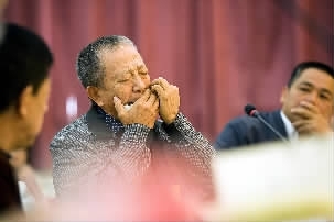 作家曹乃谦在笔会上吹奏口琴。