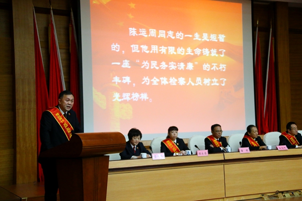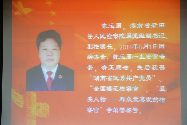 “陈运周同志的一生是短暂的,但他用有限的生命铸就了一座‘为民务实清廉’的不朽丰碑,为全体检察人员树立了光辉榜样。”群众最喜爱检察官、全国模范检察官湖南省新田县检察院原副检察长陈运周先进事迹报告人——湖南省新田县人民检察院反渎职侵权局局长邓艳雄带来题为《清廉干净铸检魂》的报告。他引用最高人民检察院检察长曹建明对陈运周同志的评语将报告会推向了高潮。