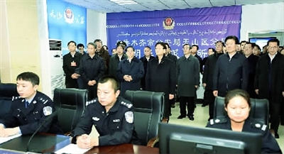 12月11日至12日,中共中央政治局委员、中央政法委书记孟建柱在新疆乌鲁木齐调研。图为孟建柱在天山区明华街派出所考察。郝帆 摄
