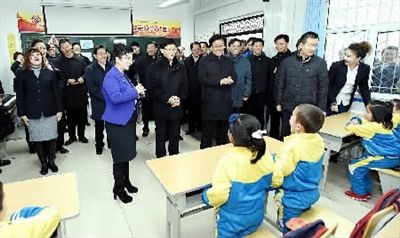12月11日至12日,中共中央政治局委员、中央政法委书记孟建柱在新疆乌鲁木齐调研。图为孟建柱在沙依巴克区平顶山社区幼儿学校考察。郝帆 摄