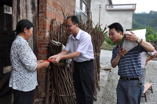 5月15日,为加强同群众联系,了解群众的困难,和征求检察工作的意见建议,全州县人民检察院结合开展群众路线教育活动。该院党组书记、检察长王唐飞率全体党组成员及部分干警深入该院挂点村古留村委开展“送政策、送温暖、送服务”活动。图为王唐飞向该村贫困户赠送慰问金、大米和食用油等慰问品。