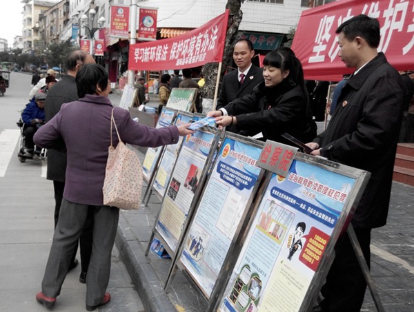 广西检察网12月9日讯(通讯员 彭田丰)12月4日是我国首个国家宪法日,也是全国法制宣传日。上午,广西壮族自治区灌阳县检察院按照县政法委的部署,会同公安、法院、司法、环保、计生、工商等多部门开展主题为“讲法治、促发展”普法宣传活动。