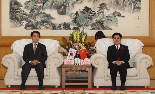 自治区检察院党组书记、检察长崔智友(右)会见韩国济州地方检察厅检事长朴正植(左)