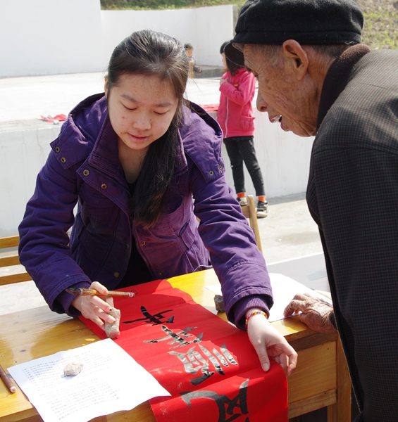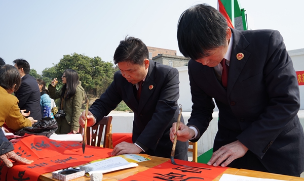 2月6日,良庆区检察院到帮扶村那陈镇那徐村开展“普法迎新春 祝福进农家”法治宣传活动。图为检察干警为村民写春联。