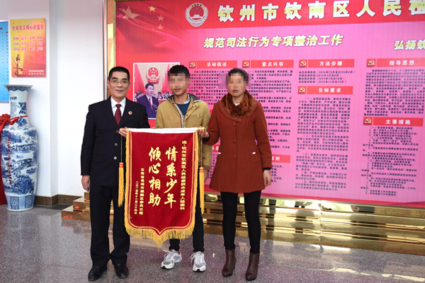 2015年12月29日,李某的母亲给钦南区检察院送来了“情系少年,倾心相助”的锦旗,以表达内心的感激之情。她说,正是检察院的人性化执法和帮助,给一时失足的儿子获得了重生的机会,给一家人的未来带来了光明和希望。