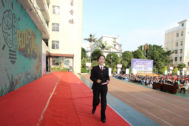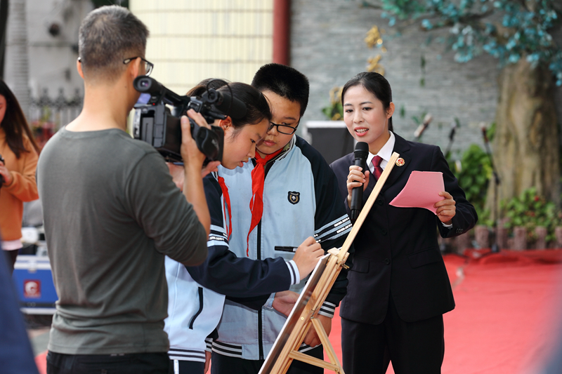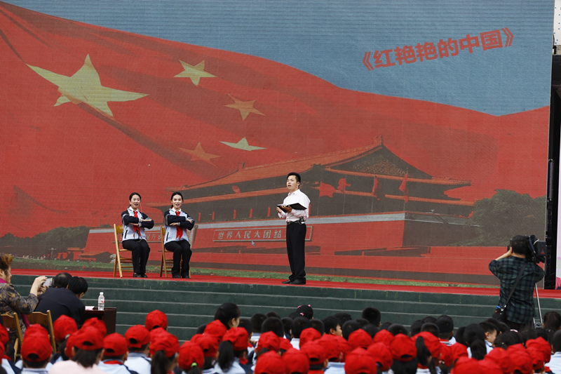 台上两名“稚气未脱”的同学,是由巡讲团讲师所扮演。为了让同学们更容易理解和接受讲师所讲授的法治知识,讲师们自编自导自演了《红艳艳的中国》。