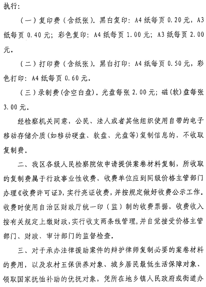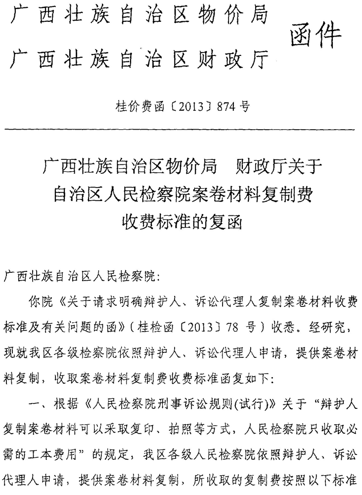 广西壮族自治区物价局 财政厅关于自治区人民检察院案卷材料复制费收费标准的复函