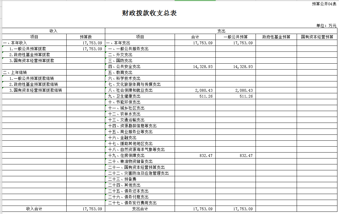四、财政拨款收支总表