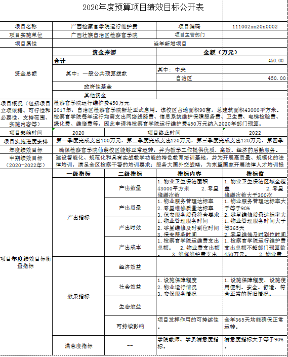 (一)广西检察官学院运行维护费450万元,年度绩效目标是确保检察官学院仙葫校区能够正常运转,并为教学工作提供优质、高效、经济的后勤服务。