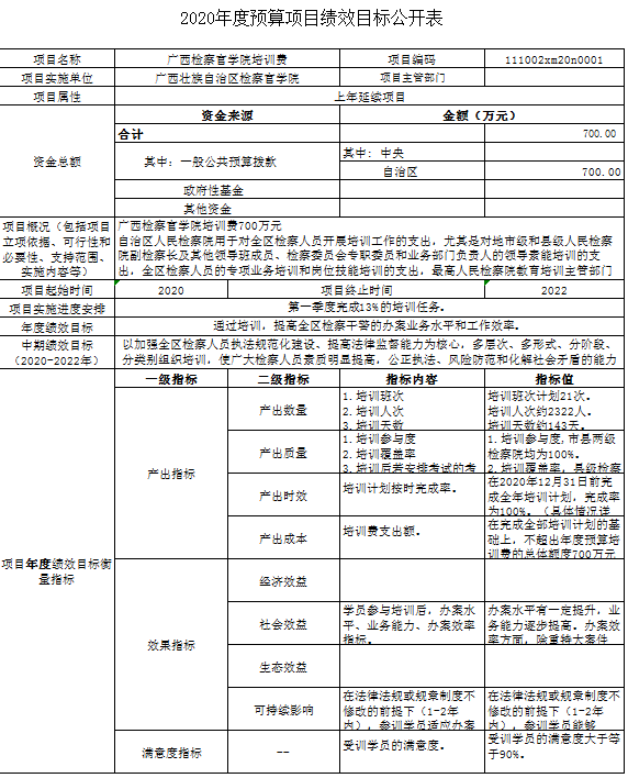 (二)广西检察官学院培训费700万元,年度目标是以一线办案骨干为重点,以修改后刑事诉讼法、民事诉讼法、行政诉讼法和相关配套法律法规为主要内容,认真抓好专项业务培训,重点解决在司法实践中遇到的突出问题和疑难困惑;组织好各种岗位练兵活动,采取业务竞赛、业务评比、实训操作、现场观摩等方式为基层检察院培养一批业务骨干;加大新录用人员和初任检察官资格培训力度,抓好基层检察院领导班子成员素能培训。
