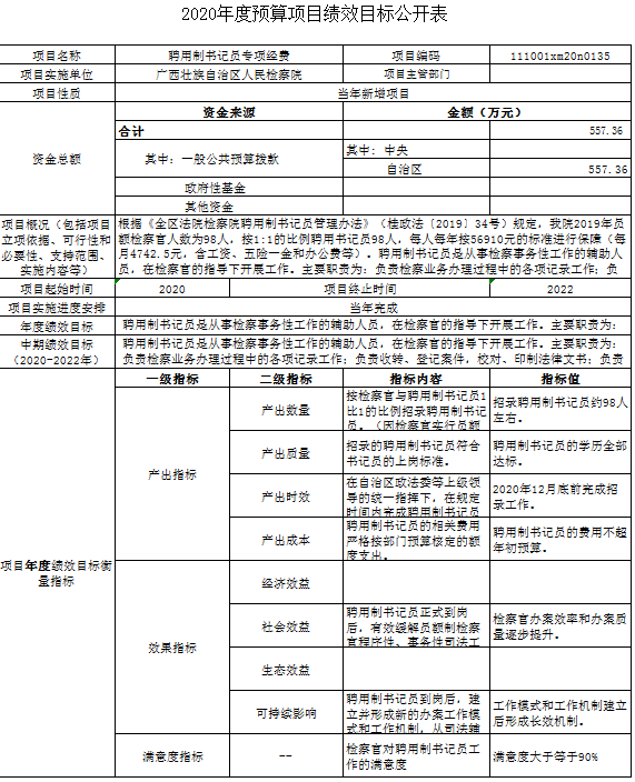 (四)聘用制书记员专项经费557.36万元,年度绩效目标是聘用制书记员是从事检察事务性工作的辅助人员,在检察官的指导下开展工作,负责检察业务办理过程中的各项记录工作;负责收转、登记案件,校对、印制法律文书;负责录入、复印、保管、整理案件材料,装订案卷、归档;完成检察官、检察官助理交办的其他事务性工作等,更好地开展各项检察工作。