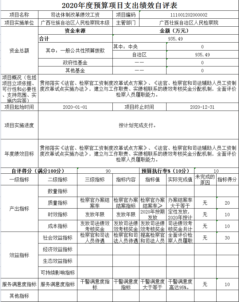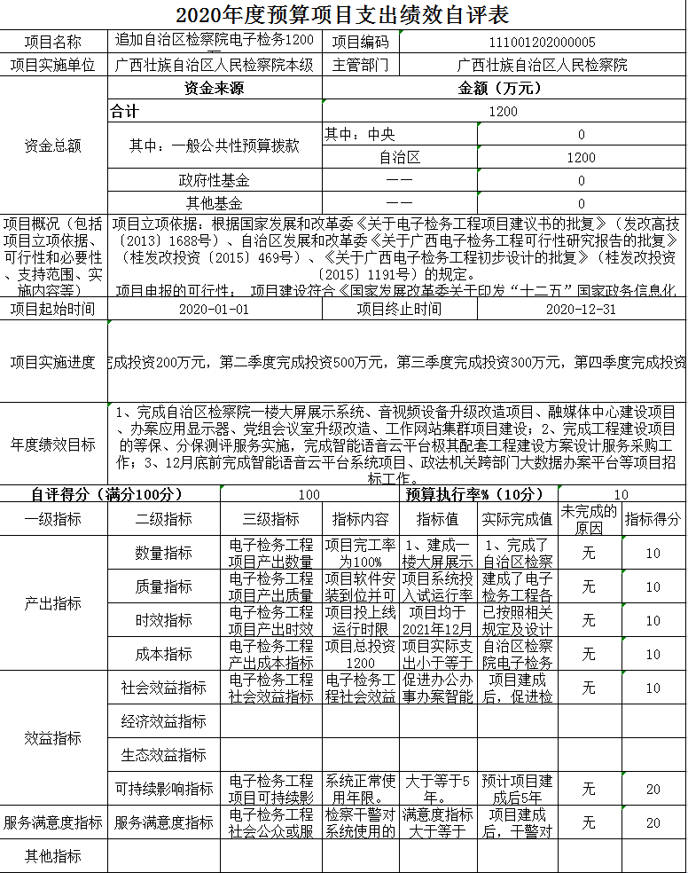 我部门根据年初设定的绩效目标,(1)广西电子检务工程项目自评得分为100分。主要经验做法:一是加强组织领导,提高思想认识;二是细化分工,落实责任;三是强化督导检查。存在的问题:检察信息化建设和应用与形势发展要求还有差距,检察工作科技化、信息化水平有待于提升。工作改进建议:进一步加大经费投入,从根本上解决信息化建设短板问题。