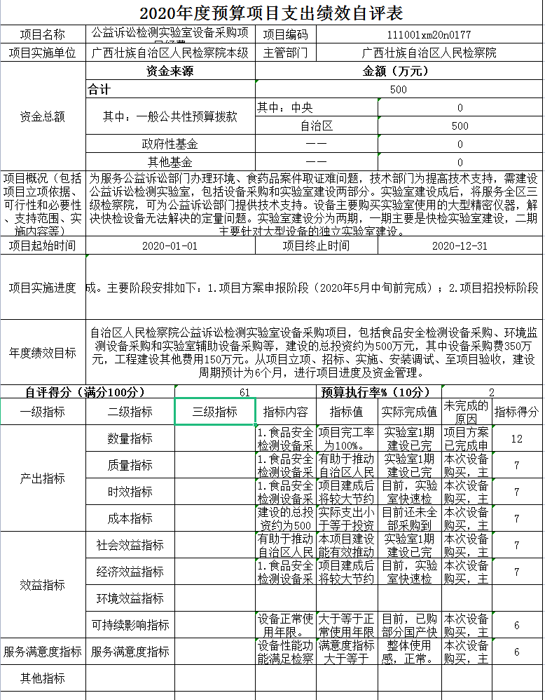 (2)公益诉讼检测实验室设备采购项目自评分100分。主要经验做法:一是领导重视。党组讨论,院领导牵头负责;二是细化分工,落实责任。八部提需求,技术部门负责起草报告、审核方案,行装部门负责落实经费和招标采购;三是强化督导检查。项目实施各环节,院处领导全程把关。存在问题:公益诉讼检测专业技术人员缺乏,影响设备的使用。工作改进建议:一是加强公益诉讼检测专业技术人员培训工作;二是调入3-5名检测专业技术人员。